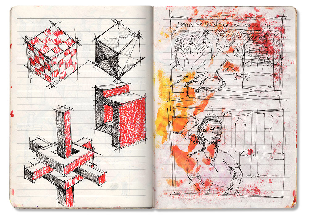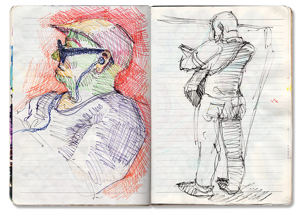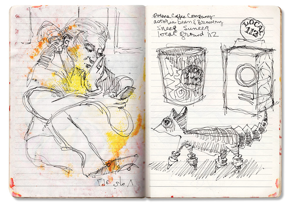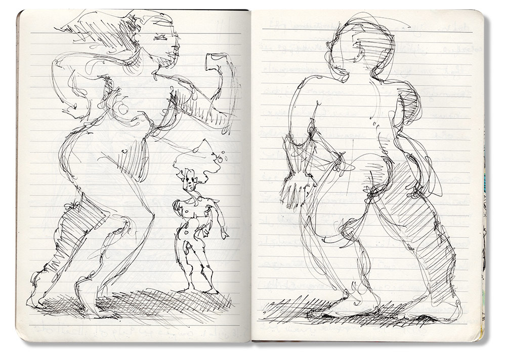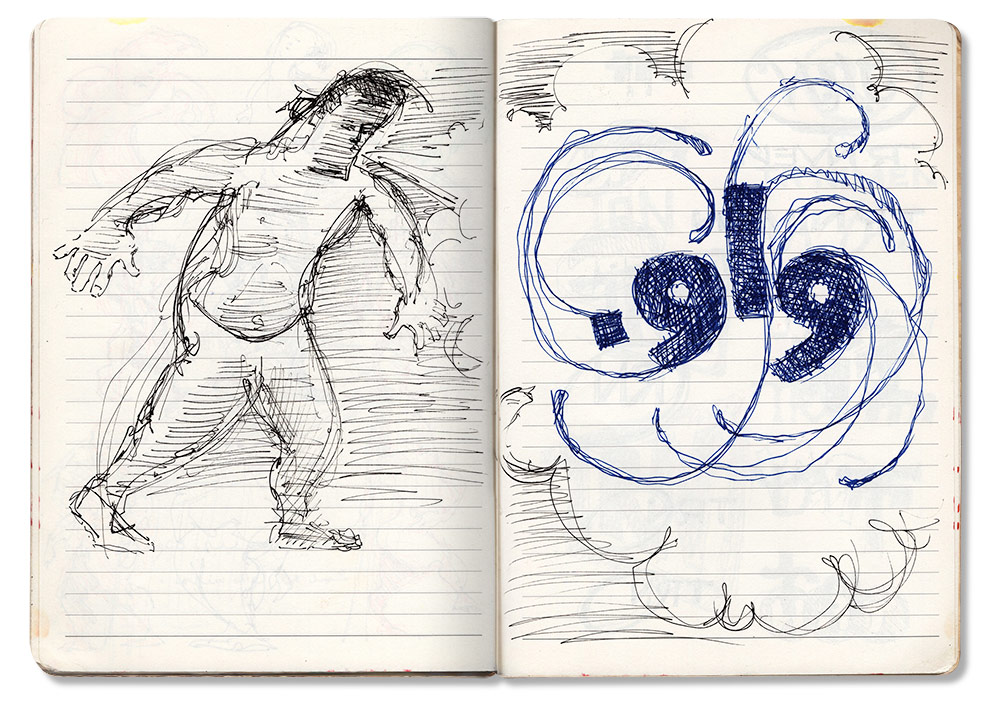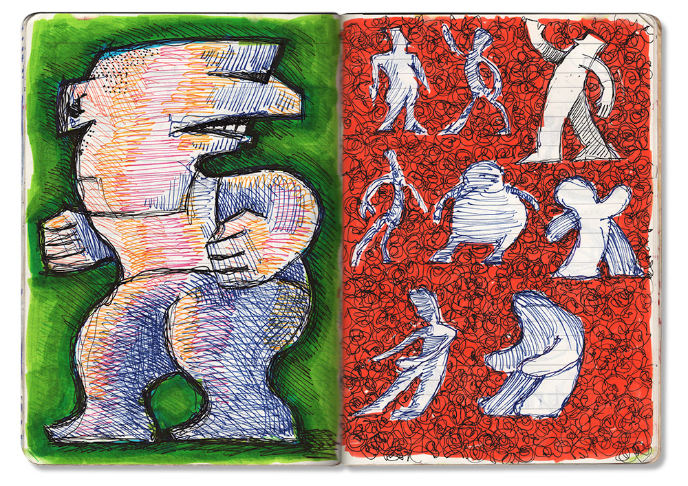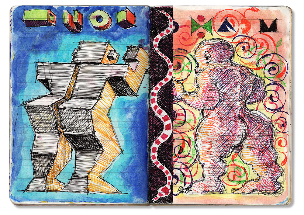 This journal was a gift, and it has many pages. I decided to use them to experiment with thumbnail sketches of the human body scattered between corporate ID and painting concepts. This journal marks the main transition into color mixed media.