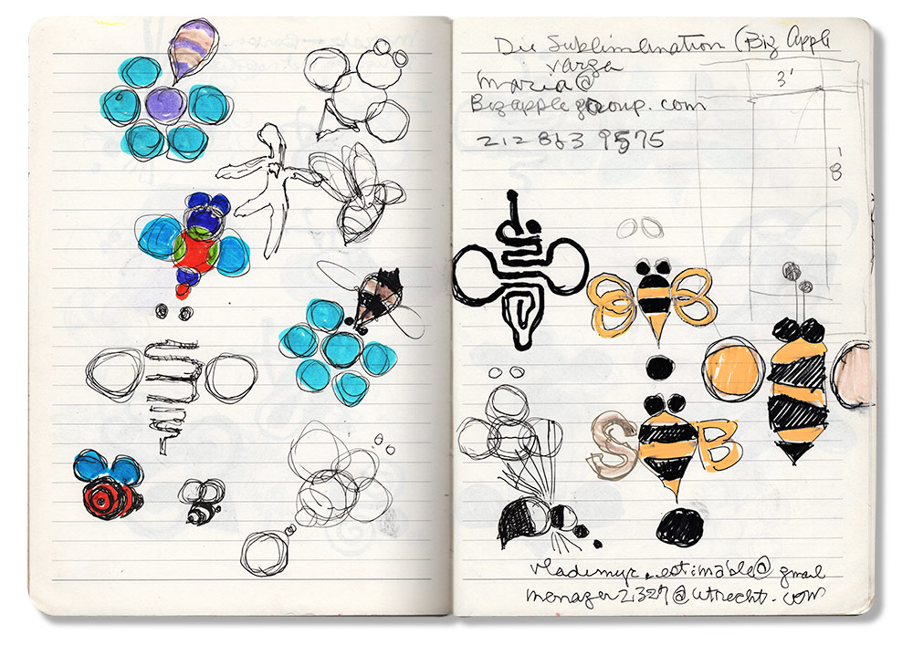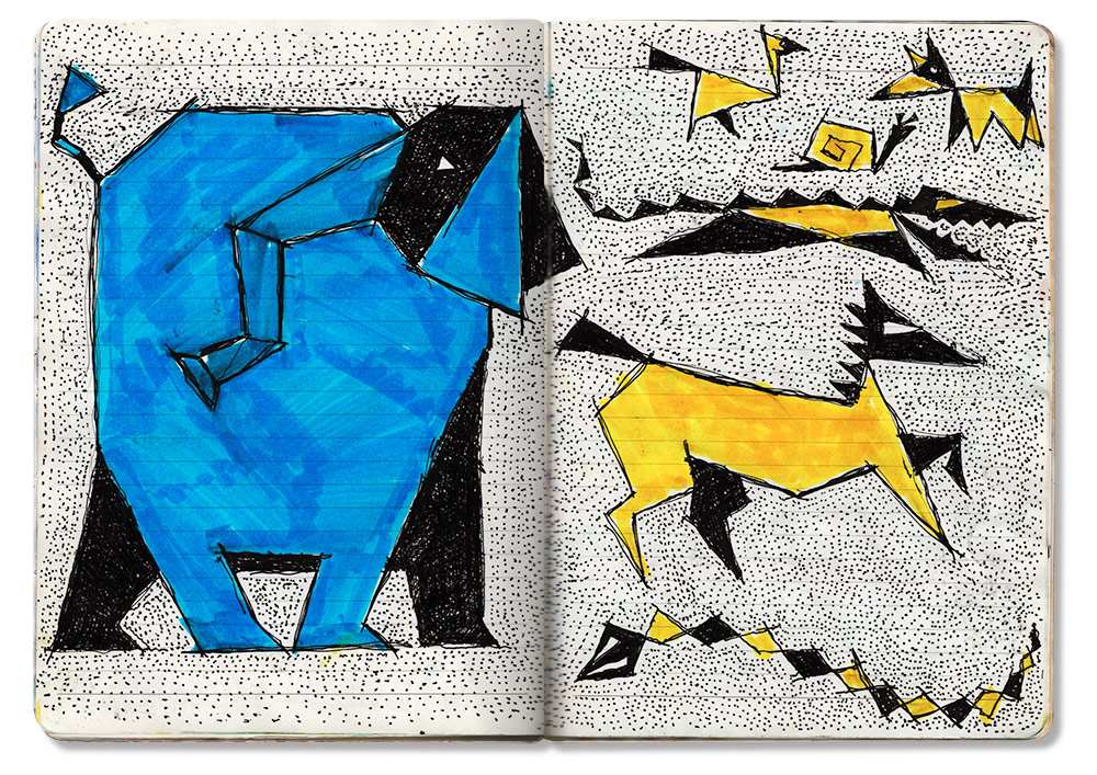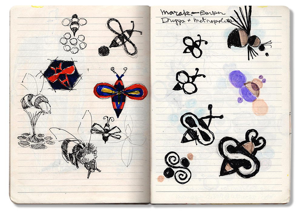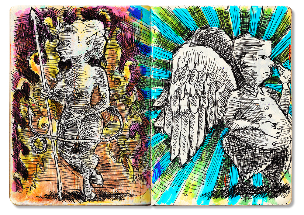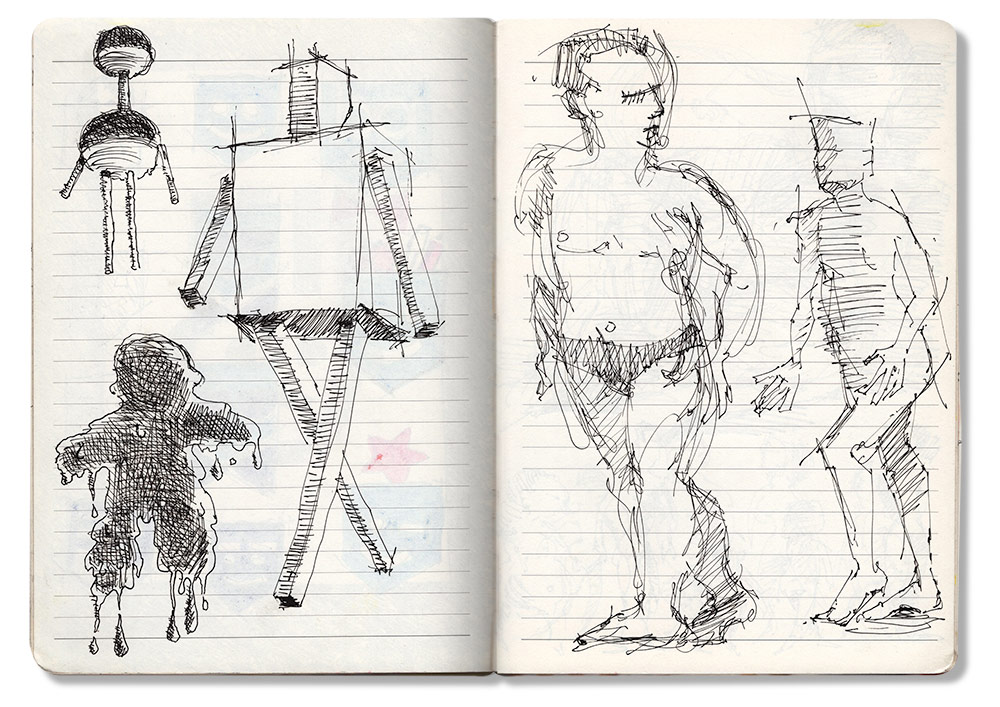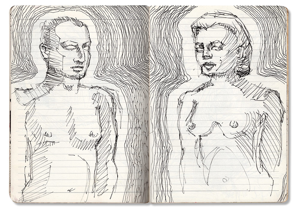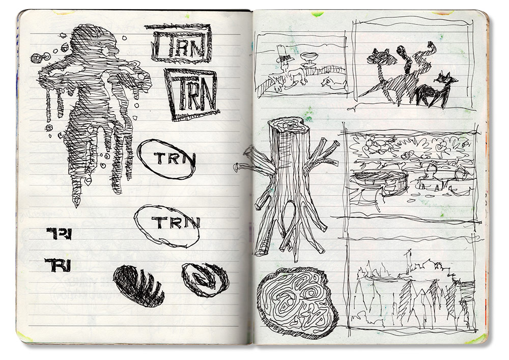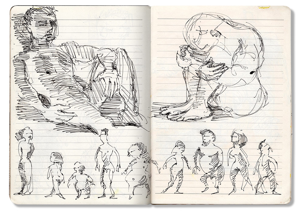 This journal was a gift, and it has many pages. I decided to use them to experiment with thumbnail sketches of the human body scattered between corporate ID and painting concepts. This journal marks the main transition into color mixed media.