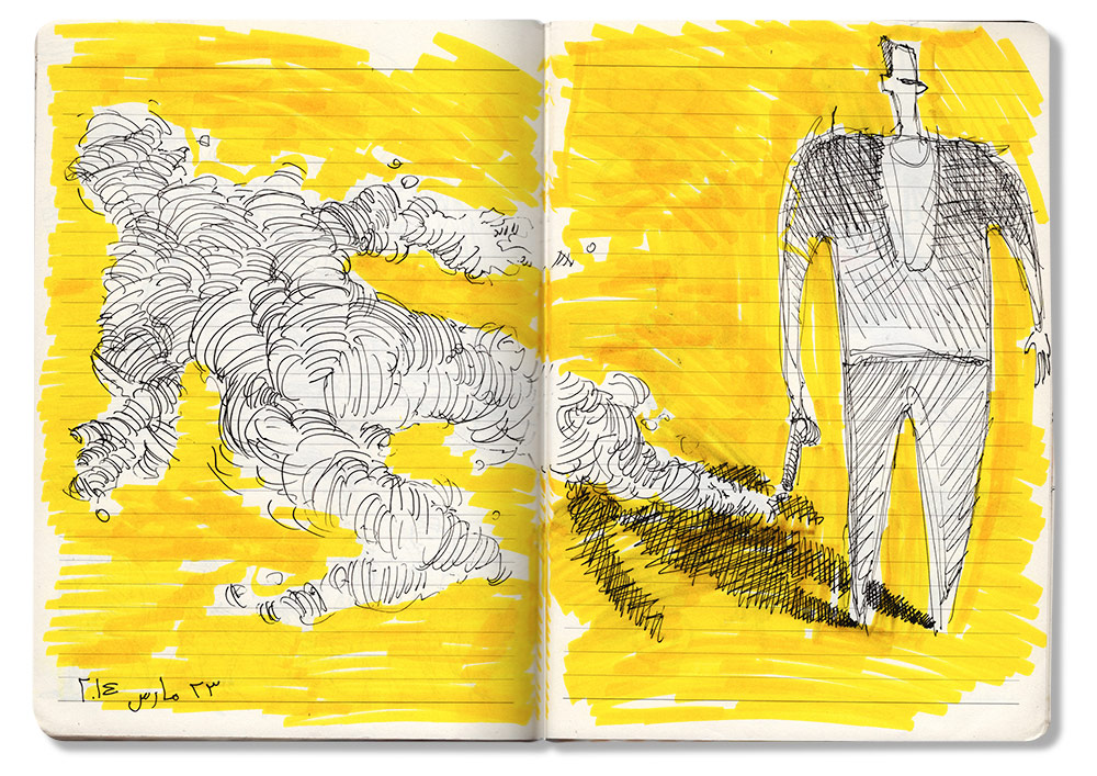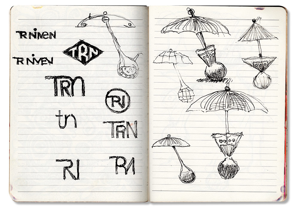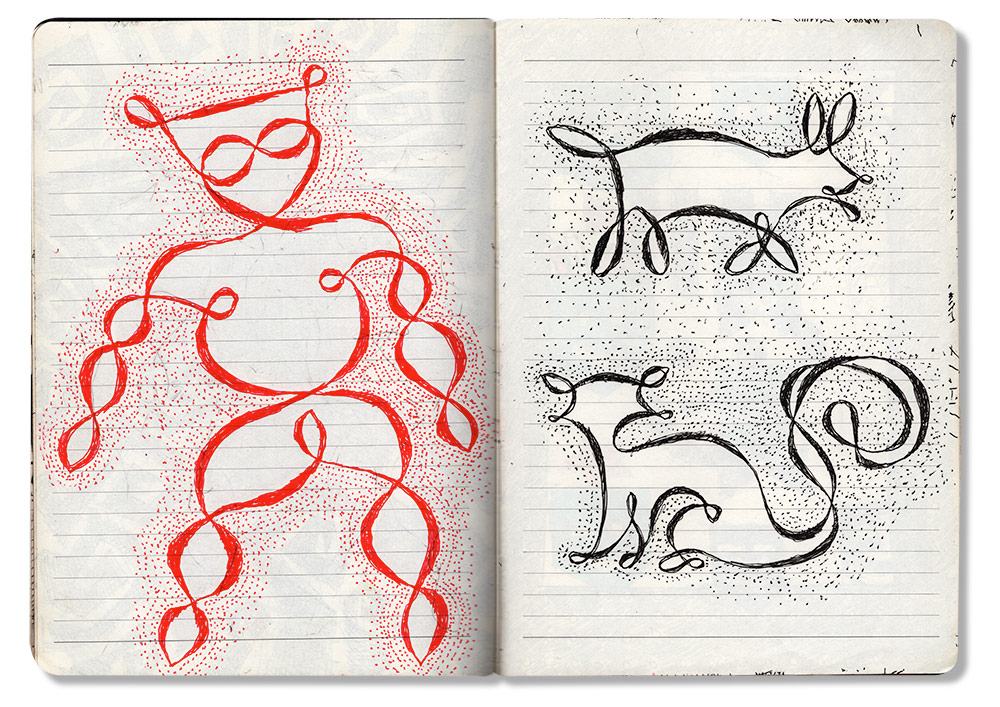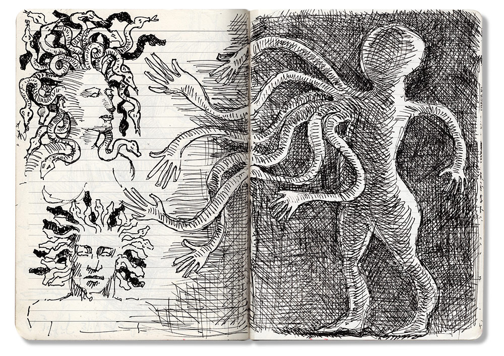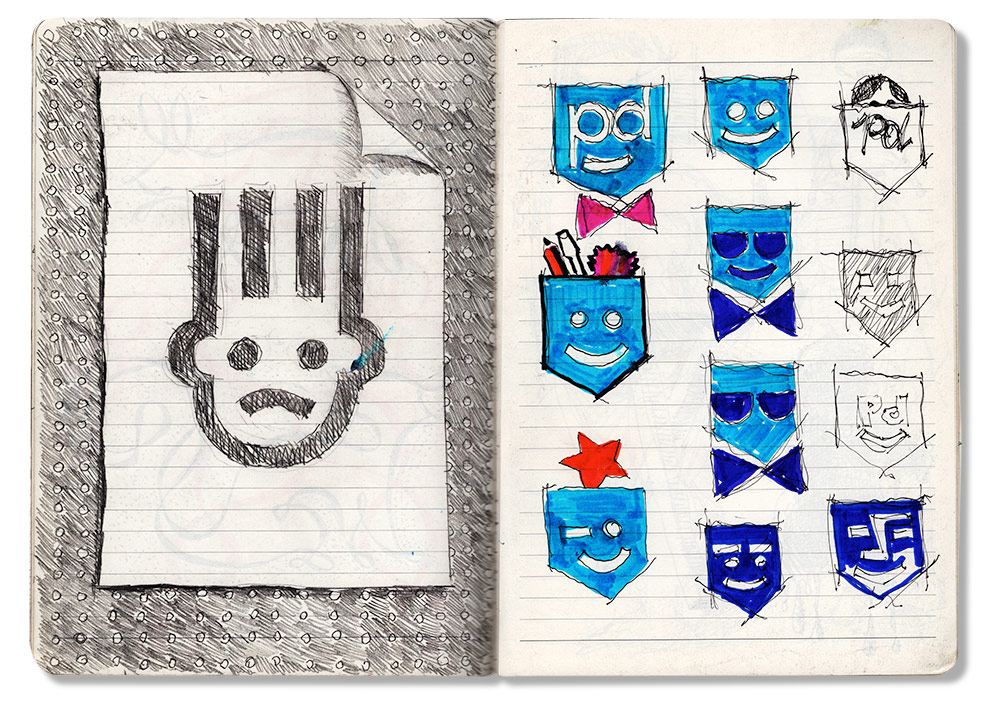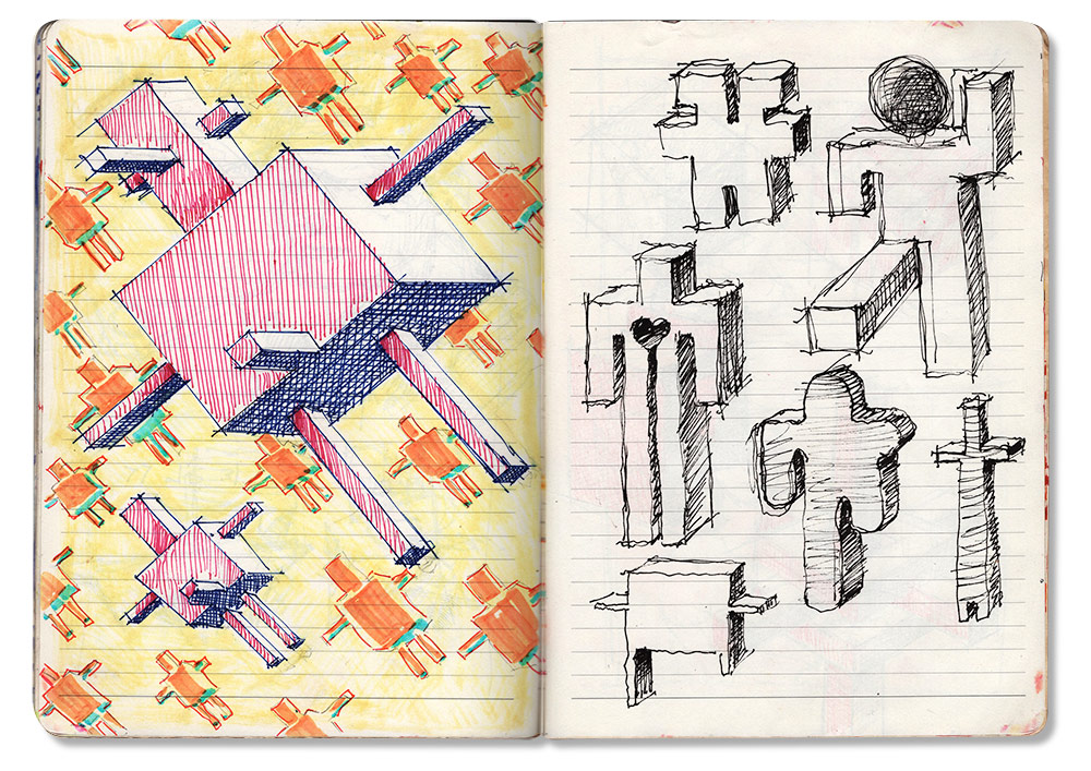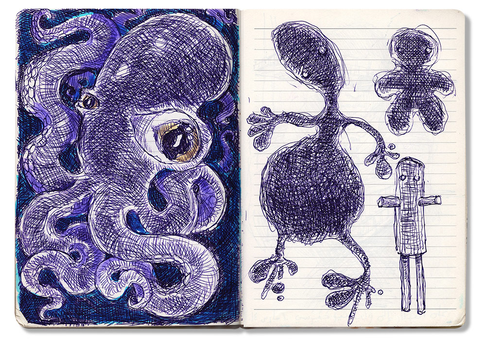 This journal was a gift, and it has many pages. I decided to use them to experiment with thumbnail sketches of the human body scattered between corporate ID and painting concepts. This journal marks the main transition into color mixed media.